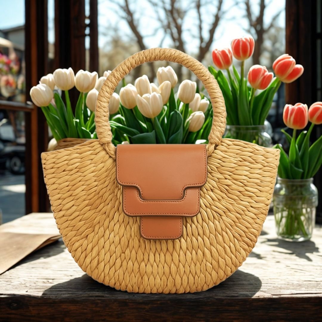 - Design: Graceful half-moon silhouette with a bold flap closure in premium faux leather, paired with a rounded woven handle for a timeless yet modern aesthetic.