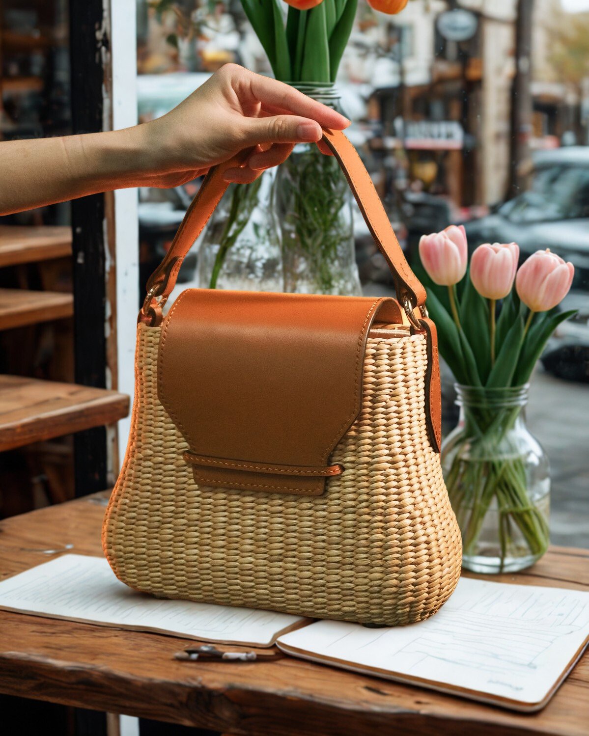 - Design: Structured trapezoid silhouette with a polished leather flap, golden hardware lock, and detachable long strap for versatile styling β from tote to crossbody. A fusion of timeless elegance and natural charm.