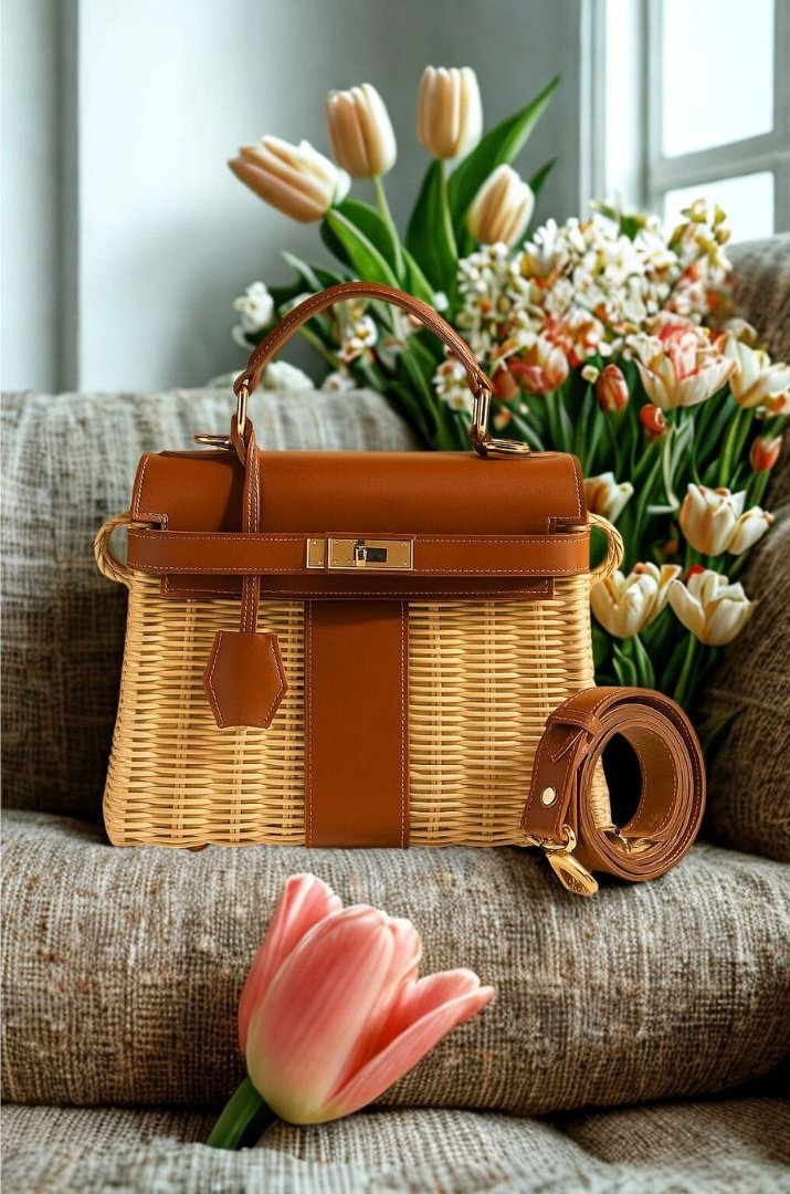 - Design: Structured trapezoid silhouette with a polished leather flap, golden hardware lock, and detachable long strap for versatile styling — from tote to crossbody. A fusion of timeless elegance and natural charm.